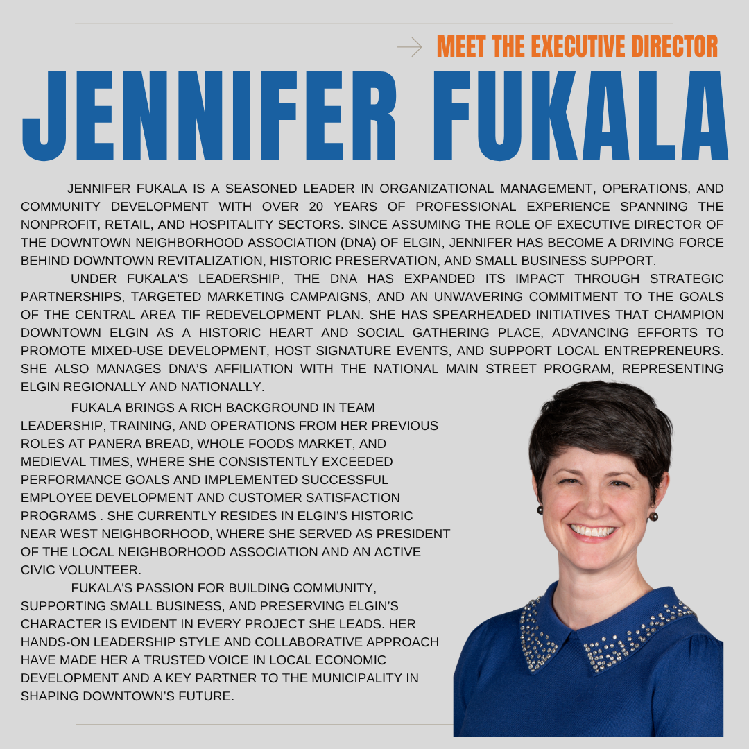 Your DNA team is dedicated to supporting every business in Downtown Elgin. Our board leadership, employees, volunteers and supporting members are each 100% dedicated to promoting Downtown Elgin.