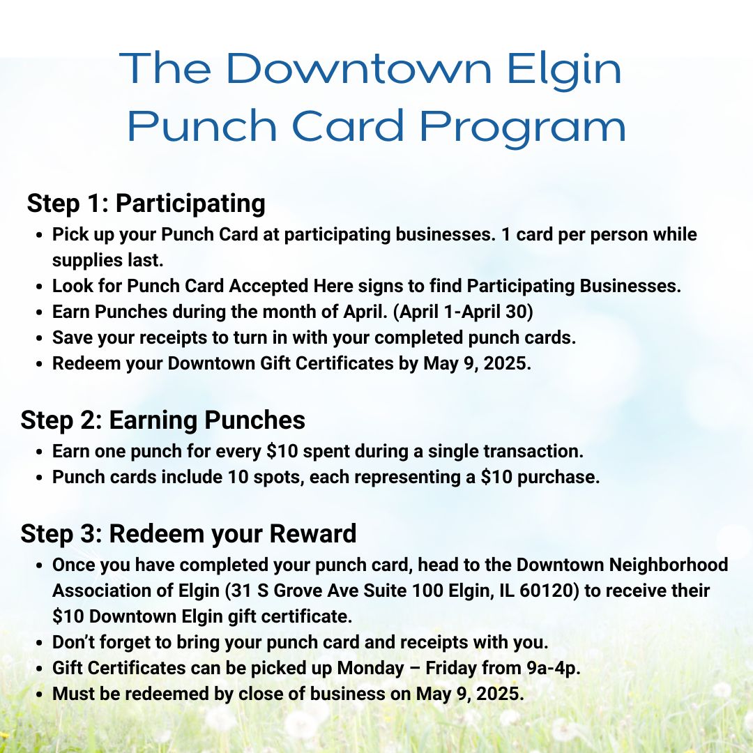 Support local businesses and get rewarded! For every $10 you spend at participating Downtown Elgin restaurants and retailers, you’ll receive a punch on your card. Once you collect 10 punches ($100 spent), you’ll earn a $10 Downtown Elgin gift certificate to use at select locations! Look for the ‘Punch Cards Now Accepted for the Month of April’ signs to know where to shop and dine. Pick up your punch card today at participating locations and start earning!