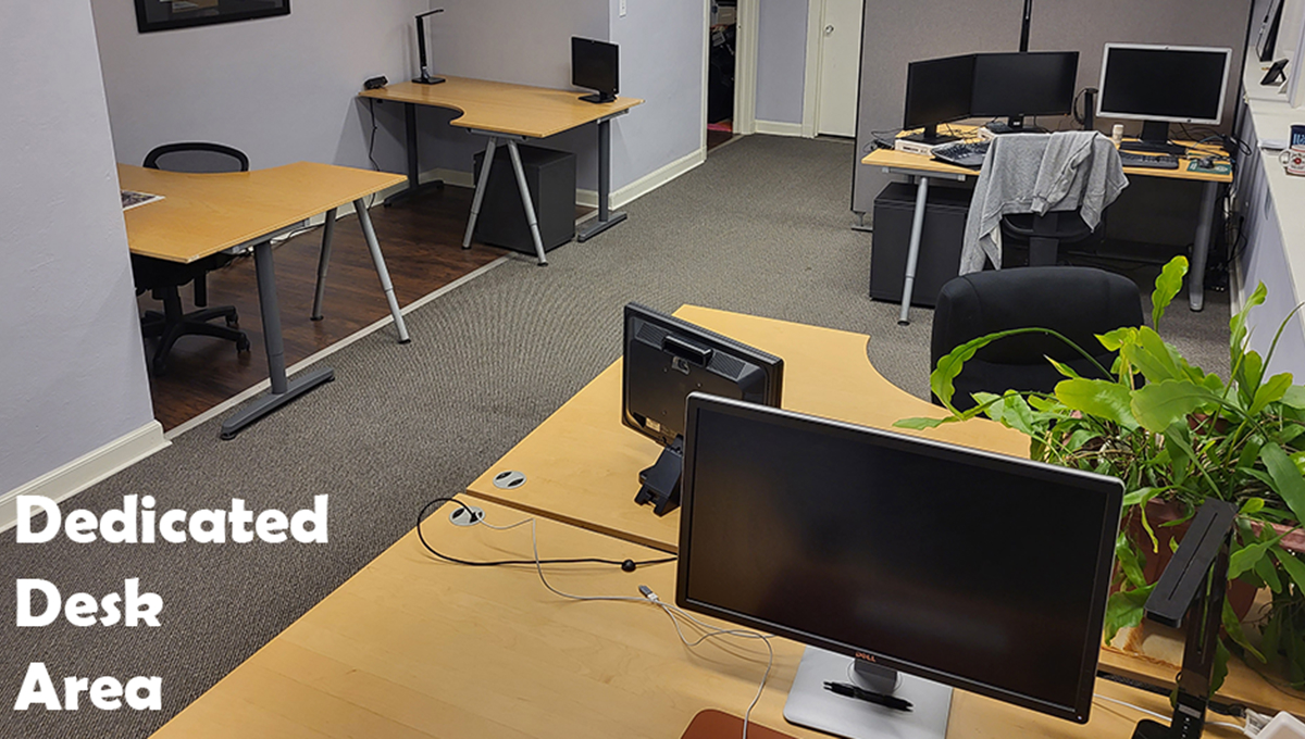 Dedicated Desks: Not ready for an office? A dedicated desk is a spot for you and only you and includes lockable storage and most all the amenities of the coworking space, including 24/7 access.