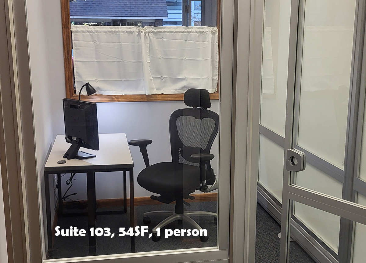 Suite 103 is available, a one person 54SF office, includes a desk, chair, keyless entry and all other coworking facility amenities.