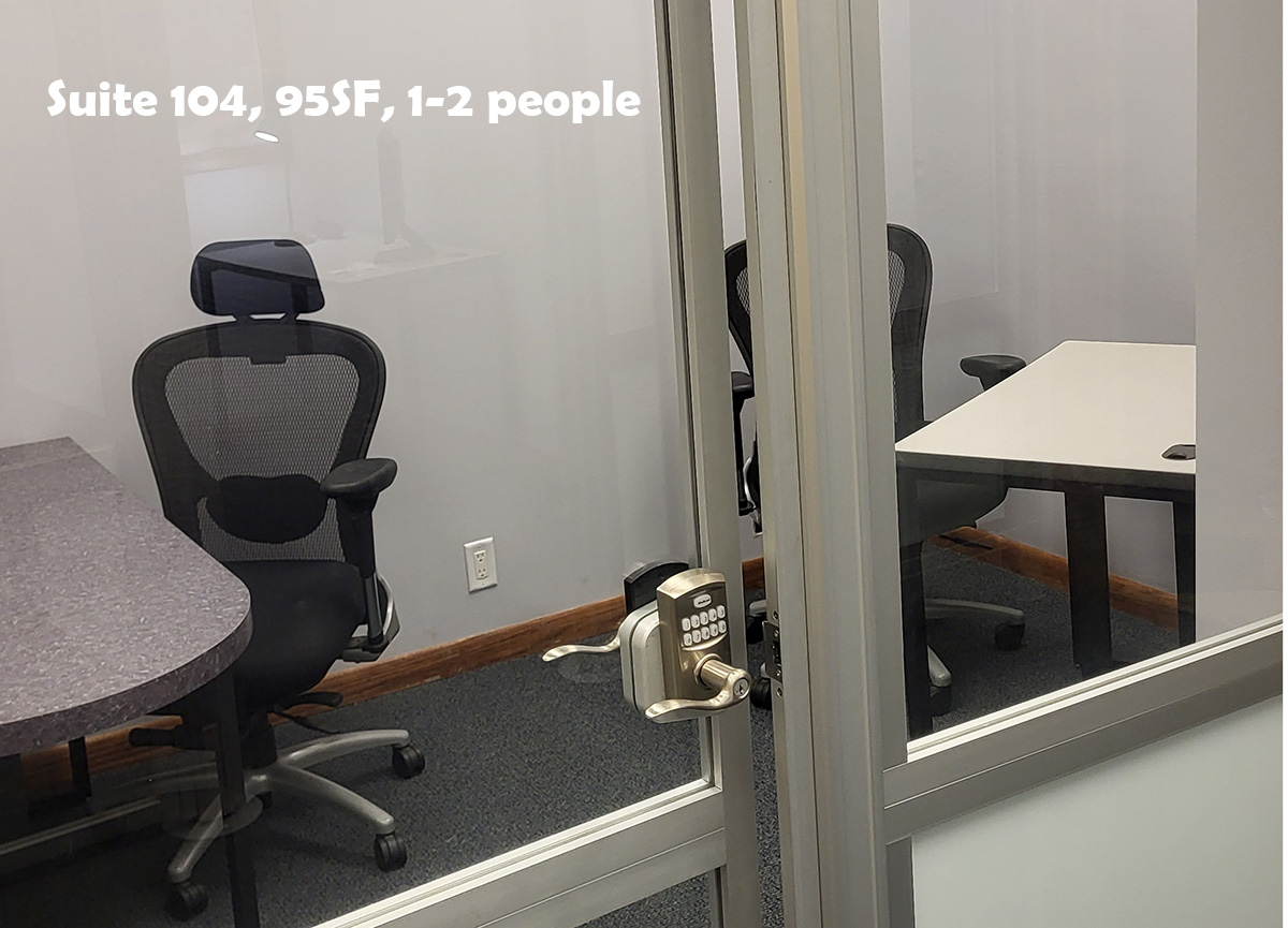 Suite 104 is available, a one or two person 95SF office, includes a desk, chair, keyless entry and all other coworking facility amenities.