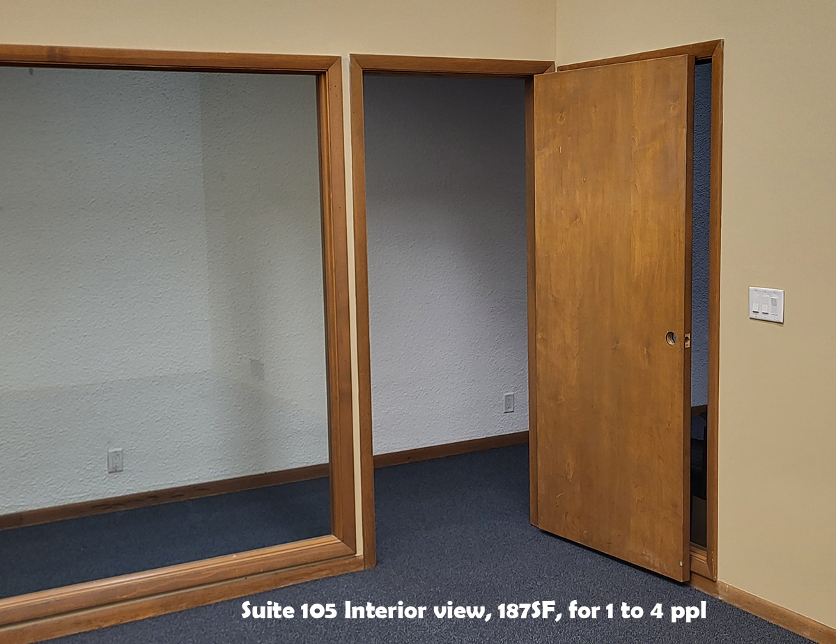 Suite 105 is available, a one to 4 person 187SF office, includes a desk, chair, keyless entry and all other coworking facility amenities.