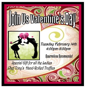 Make your reservations at Al’s Café to try their limited time only Valentine’s Day Menu on Tuesday, February 14 from 4 PM to 8 PM. The menu features appetizer, entrée, and dessert specials including Crab Cakes, Lamp Chops, Black Angus Steak & Shrimp, and Crepe Suzette amongst many other options. To make things even sweeter, Chef Tony has a special gift for all the ladies- his very own hand-rolled truffles!