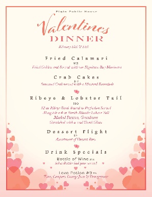 Elgin Public House is offering a limited time only Valentine’s Day Menu on Sunday, February 12 and Tuesday, February 14. Make a reservation for you and your special someone to try specials including Fried Calamari, Crab Cakes, Ribeye & Lobster tail, select $28 bottles of wine, and more!