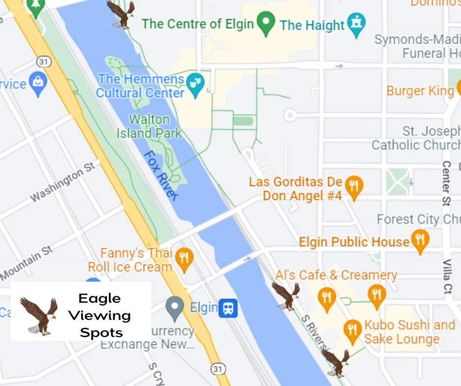 What makes Elgin so appealing to Bald Eagles? The span of the Fox River beginning north near Carpentersville through Elgin near the Grand Victoria Casino has been attracting Bald Eagles for years. Eagles follow the Fox River as they head south and are attracted to areas where they can find easy prey. The area near Walton Island and the Gail Borden Public Library is where most bird enthusiasts go to catch a glimpse of the Bald Eagles in all their glory.