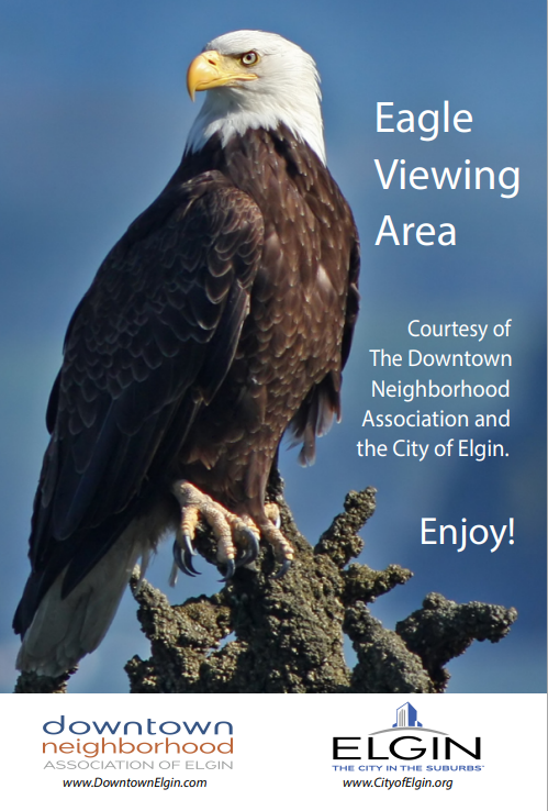 The City of Elgin’s Park Department will be clearing the sections of the Riverside Promenade under the white umbrellas during the winter months for patrons to use to view Eagles on the Fox River. Bring a camera, binoculars, and your family for a fun and unique experience. Make sure you keep your eye out for the designated signage for the Eagle Viewings. After you are done make sure to stop at one of many Downtown businesses for a coffee or food.